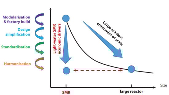 Essential economic factors to counterbalance the challenges of diseconomies of scale []. Top circle—current unit price of the SMR, bottom left circle—unit price of the SMR after implementing all processes described alongside the vertical axis. Bottom right circle—current unit price of the large reactor, dashed arrow—change of the unit price after implementing all processes described alongside the vertical axis.