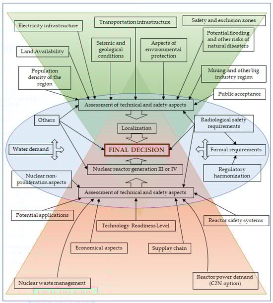 Such methodology has been developed within the framework of the DEsire project. The research carried out in the frame of the project mentioned above was reported in the previous paper []. The project, titled “Plan for decarbonization of electricity through the use of coal-fired power units using Generation III+ and Generation IV nuclear reactors,” is part of the GOSPOSTRATEG “Social and economic development of Poland in a globalizing environment” program. The project, financed by the National Center for Research and Development, is supported by a consortium consisting of the Silesian University of Technology, the Institute of Nuclear Chemistry and Technology (INCT), Energoprojekt-Katowice S.A., the Ministry of Climate and Environment, and the Sobieski Institute Foundation.