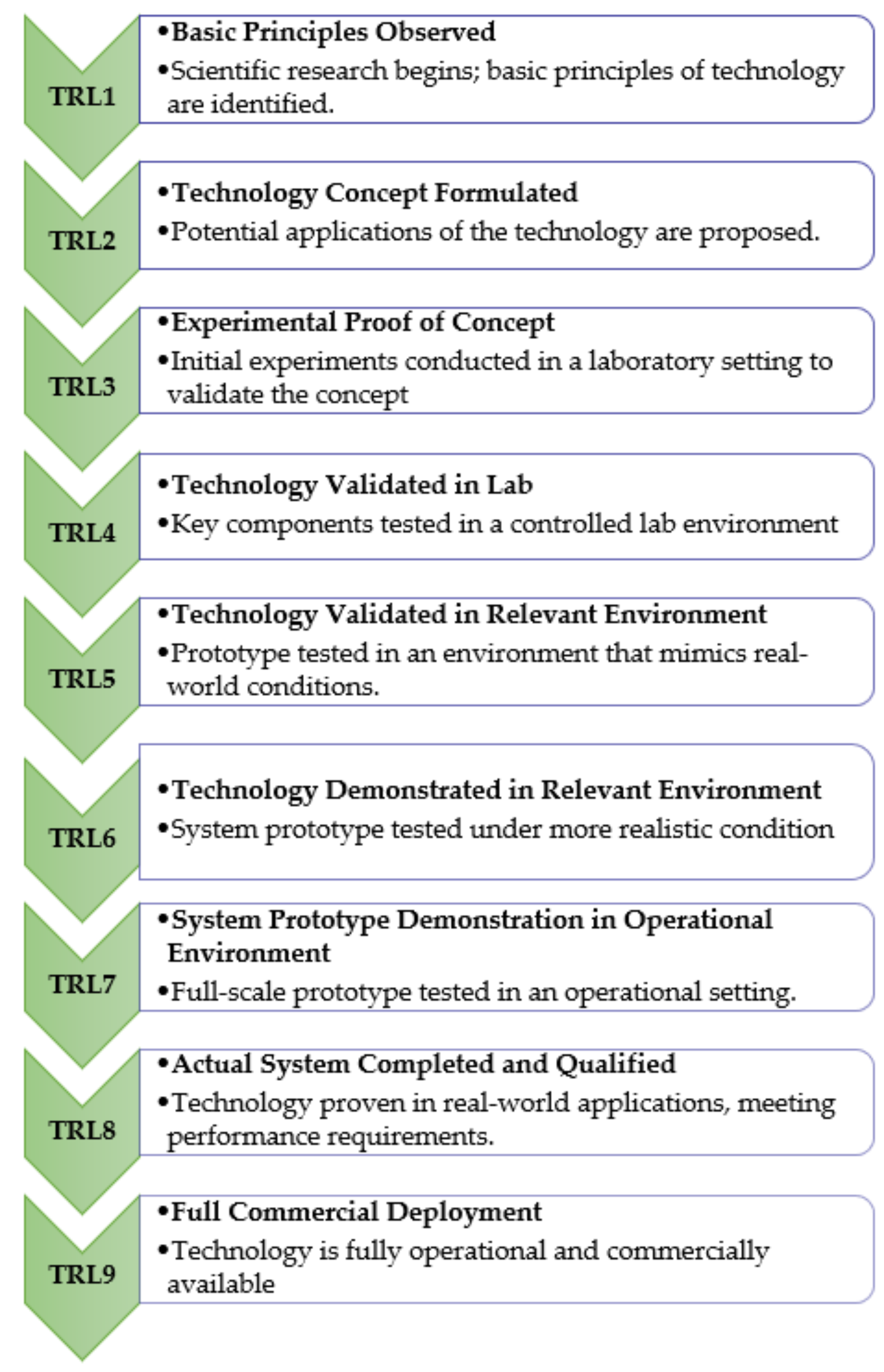 The TRL system is a nine-point scale ranging from basic scientific principles (TRL 1) to proven operational deployment (TRL 9). Each level reflects increasing fidelity and complexity. TRLs 1–4 covers concept validation in analytical or laboratory settings, TRLs 5–7 includes prototype demonstrations in relevant environments, and TRLs 8–9 represents full-scale operational use, as shown in
