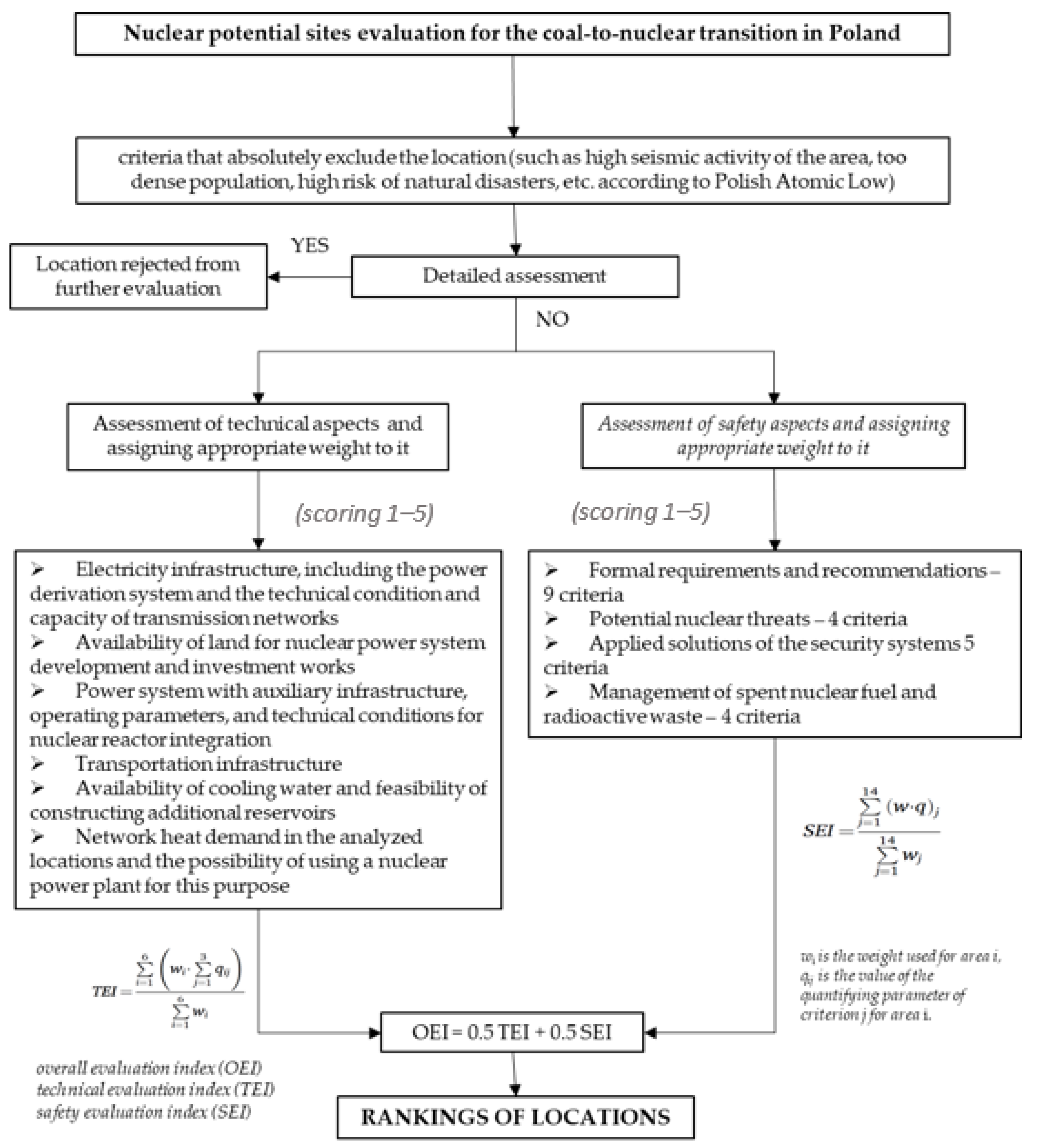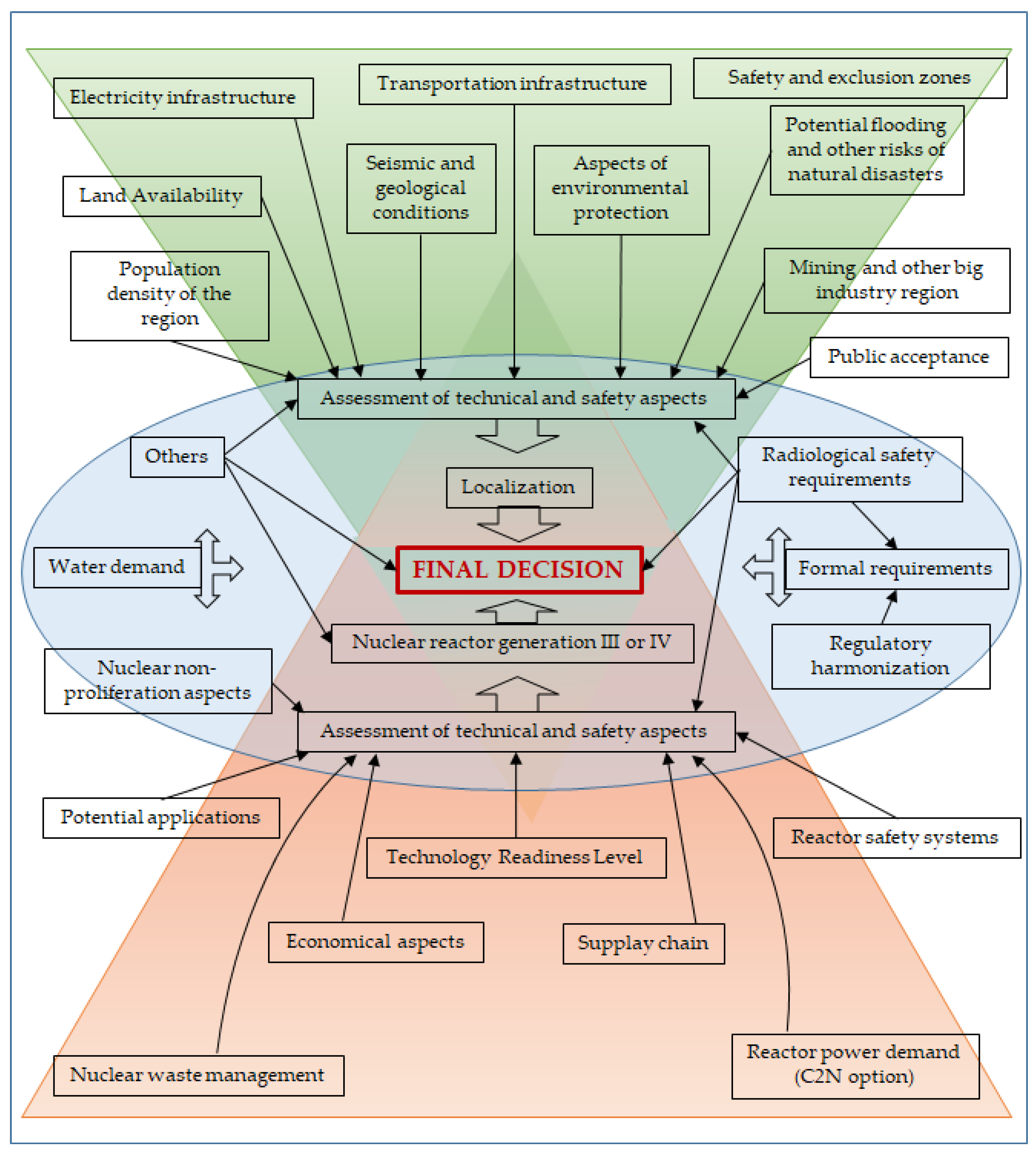 The use of SMRs for energy-intensive applications (both electricity and heat) is widely discussed. Their locations are also proposed to be close to cities, so they could supply heat to the central heating network. Finally, the technology is seen as an opportunity to decarbonize the energy sector using certain infrastructure of power plants that use fossil fuels (Coal-to-Nuclear, C2N). Such power plants are often located near population centers or sensitive economic structures. Therefore, detailed studies regarding the location of each nuclear facility should be carried out. Deterministic assessment methods can be applied over the entire operational lifetime of a facility. These methods analyze both its safety and the risk of failure. A separate and very complex issue is the local environment and its impact on climate change. Of course, the safety analysis must take into account all applicable legal regulations.