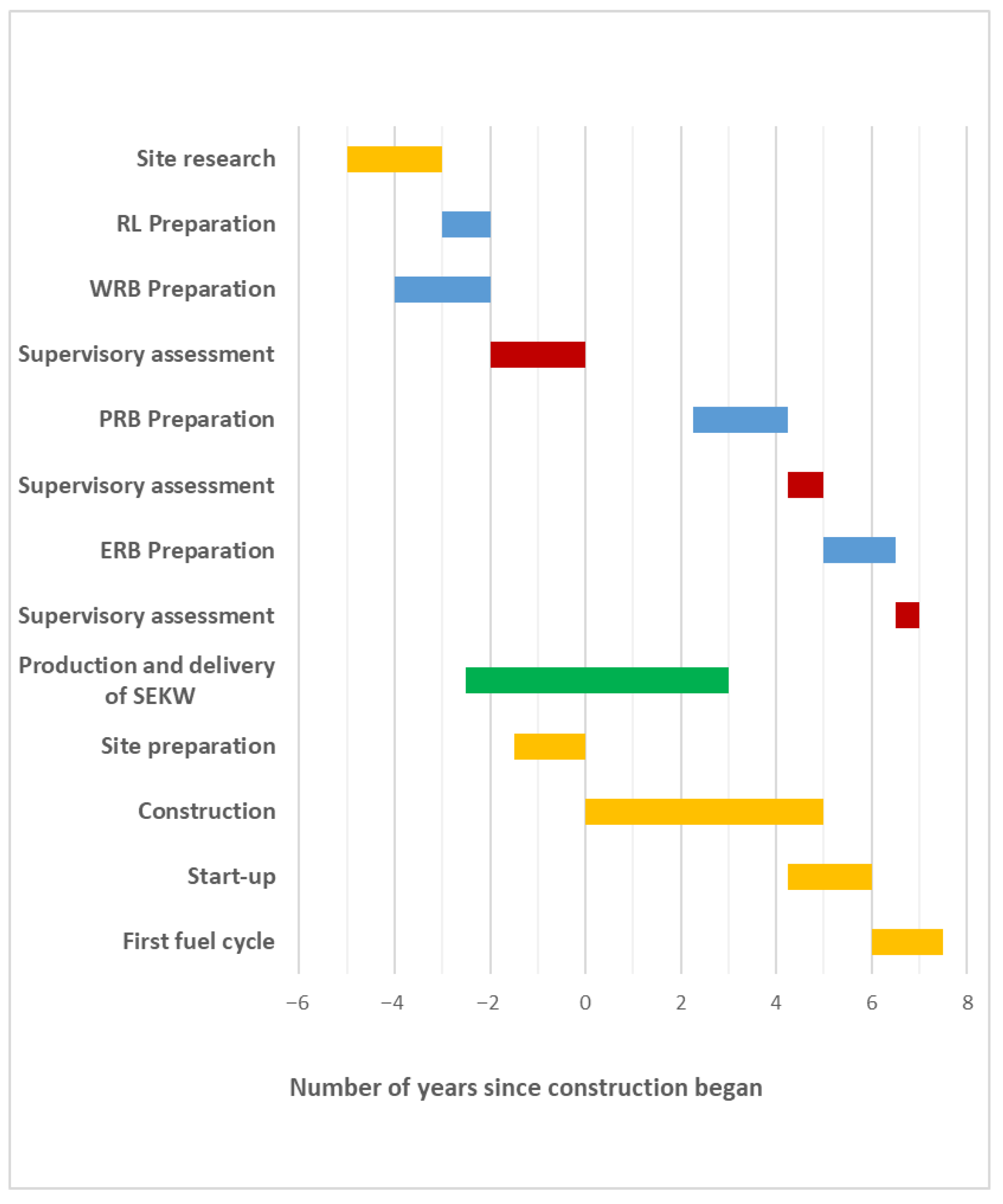 Figure 14) illustrate the licensing process for a large-scale reactor and an SMR, relative to simplified theoretical schedules for documentation preparation, construction, and commissioning of nuclear facilities. The schedules assume an average construction time of 60 months for a nuclear power plant with a large-scale reactor and 24 months for a nuclear power plant with an SMR.