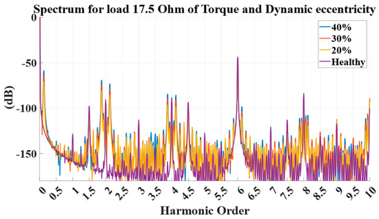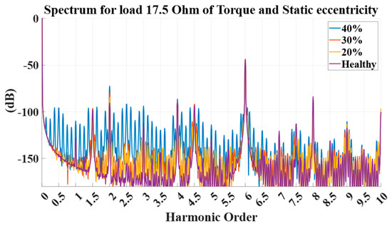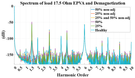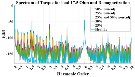 The harmonics of the torque are related to the harmonics of the stator and the rotor. Due to the dynamic nature of the fault, the harmonics of interest are the ones that are corresponding to the frequencies: . From Figure 11 and Table 9, a significant increase in these harmonics can be observed during faulty operation. Furthermore, these harmonics are different from the harmonics that are induced due to the other dynamic fault, which is non-uniform demagnetization, meaning that these faults can be identified.