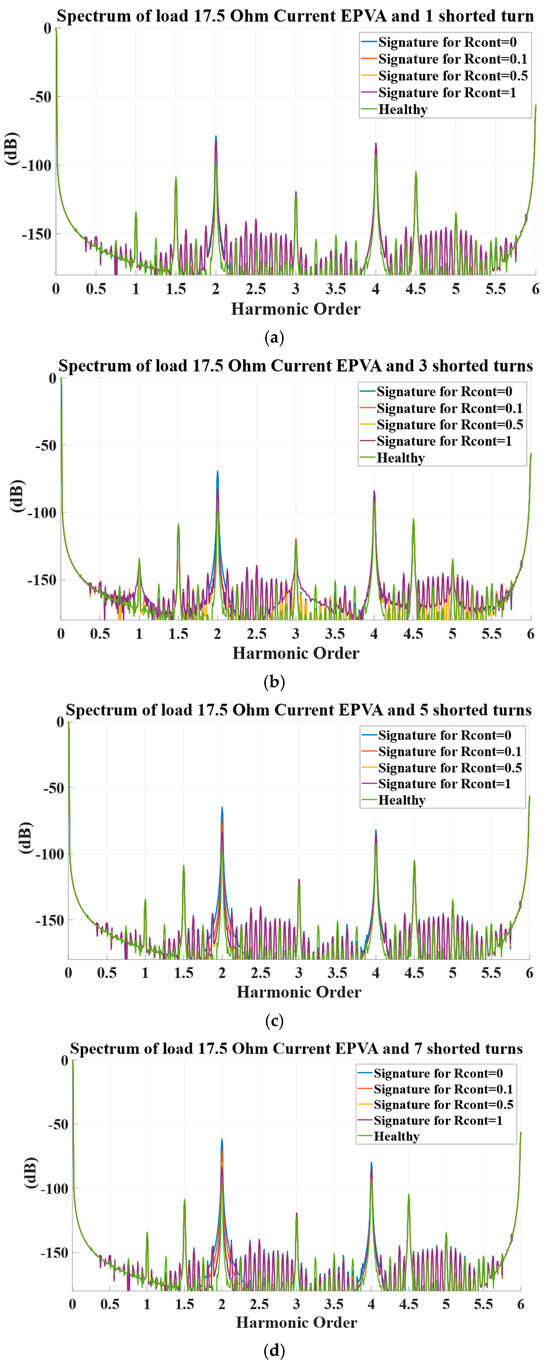 Although EPVA is usually cited as a strong indicator when spotting inter-turn shorts through the 2nd harmonic in the Park spectrum, our measurements indicate this marker collapses at extremely moderate severities either when just a couple of turns are involved or even every time a limited contact resistance limits the fault current. For cases with 1–3 shorted turns, the second-harmonic and fourth-harmonic level remains essentially indistinguishable from the healthy baseline (see Table 5 and Table 6 and Figure 4), confirming that even though EPVA tends to outperform conventional MCSA. The diagnostic cue is still weak at the lowest severities [35]. A definite increase in the quarter harmonic is just found at ≈20% severity (41 turns), exactly where its magnitude exceeds the wholesome resource of’ −84.70 dB. In a nutshell, while EPVA can, in principle, register early stator winding faults, and low-level ITSC usually produces false negatives as the second-harmonic component is throttled by the existence of any stator phases asymmetry. Efficient identification of such incipient cases generally requires complementary channels (e.g., torque-based or flux-based features), whereas EPVA stays effective for much more pronounced ITSC conditions in larger-scale tests [36].