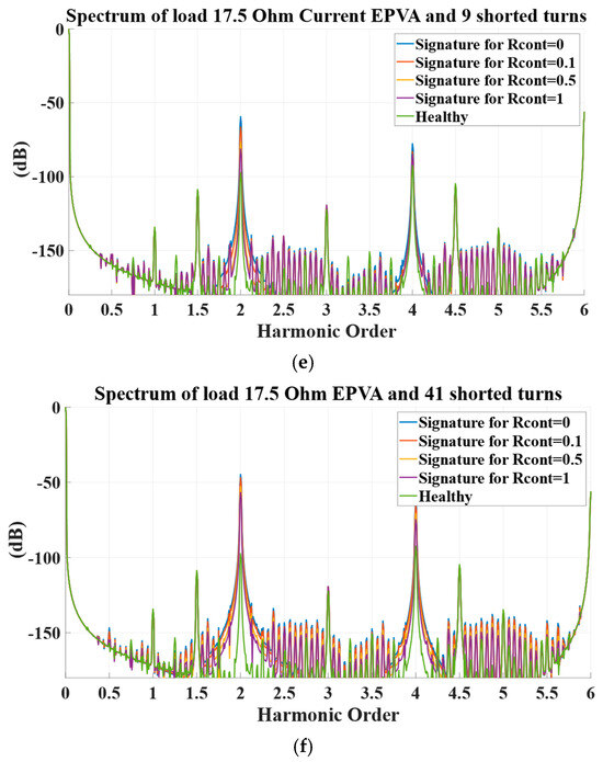 EPVA results for faulty cases (blue R_cont = 0, red R_cont = 0.1, orange R_cont = 0.5, purple R_cont = 1) versus the healthy (green) showing (a) 1 shorted turn, (b) 3 shorted turns, (c) 5 shorted turns, (d) 7 shorted turns, (e) 9 shorted turns, and (f) 41 (20%) shorted turns with the generator phases connected to resistive loads of 17.5 Ω.