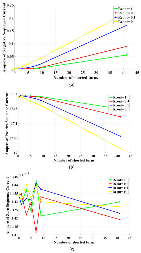 Current results for faulty cases (yellow R_cont = 0, blue R_cont = 0.1, red R_cont = 0.5, green R_cont = 1) where (a) negative-sequence current, (b) positive-sequence current, (c) zero-sequence current.