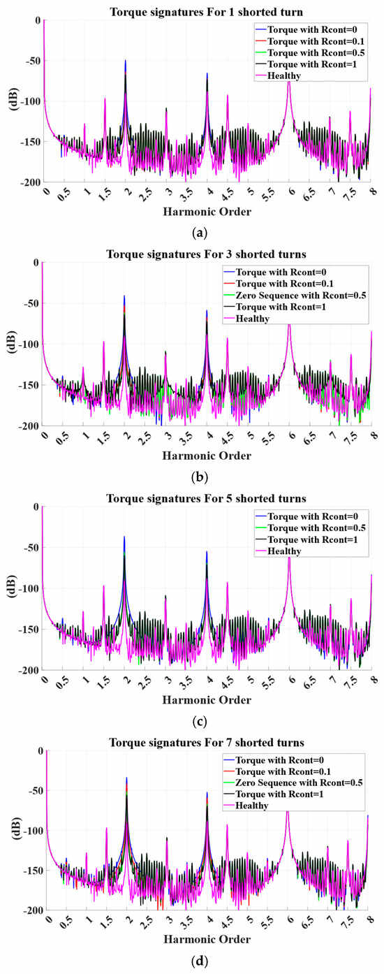 The ITSC will also increase the vibrations in the torque of the generator. Although the torque in real applications cannot be directly measured, the harmonics of the torque will be similar with the harmonics of the vibrations of the machine. As ITSC is a static fault, the harmonics that will be investigated are the 2nd- and 4th-order harmonics. From Figure 6 and Table 7, it can be seen that the amplitude of the 2nd-order harmonic increases significantly even at low severity faults. As shown in Table 8, the 4th-order harmonic also experiences a noticeable increase in its amplitude, but the increase is not significant at low-severity cases.