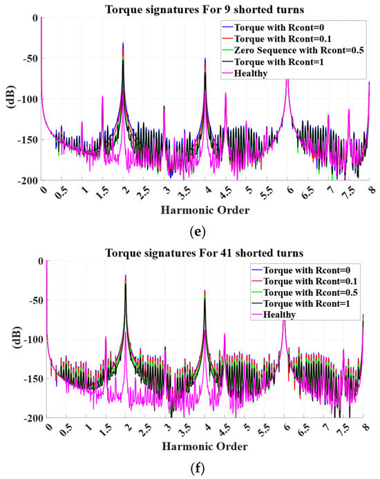 Torque results for faulty cases (blue R_cont = 0, red R_cont = 0.1, green R_cont = 0.5, black R_cont = 1) versus the healthy (magenta) where (a) 1 shorted turn, (b) 3 shorted turns, (c) 5 shorted turns, (d) 7 shorted turns, (e) 9 shorted turns, and (f) 41 (20%) shorted turns.