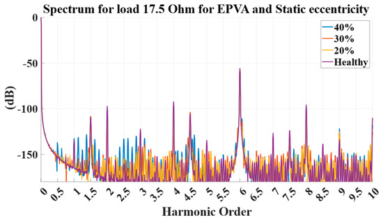 EPVA results for faulty cases (where yellow—20% static eccentricity, red—30% static eccentricity, blue—40% static eccentricity) versus those that are healthy (purple).