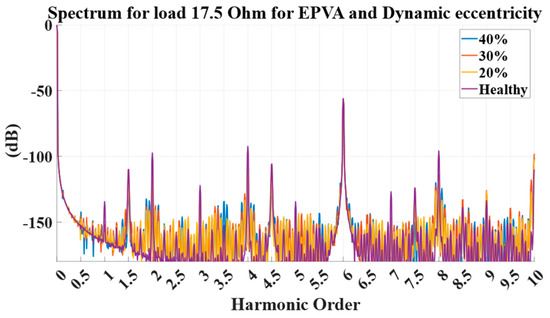 EPVA results for faulty cases (where yellow—20% dynamic eccentricity, red—30% dynamic eccentricity, blue—40% dynamic eccentricity) versus those that are healthy (purple).