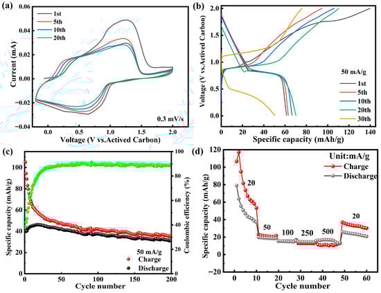Cyclic voltammetry (CV) tests were conducted using an electrochemical workstation (CHI660E), with a voltage range of 0.01–2.0 V and a scan rate of 0.3 mV/s. Galvanostatic charge–discharge tests were performed using a NEWARE battery testing system (NEWARE CT-4000), at a current density of 50–500 mA/g and a voltage range of 0.01–2.0 V. Electrochemical impedance spectroscopy (EIS) tests were carried out to analyze reaction kinetics, with a frequency range of 0.01 Hz–10 kHz and an amplitude of 10 mV.