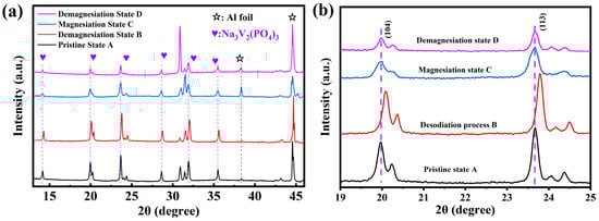 Crystal structure changes of Na3V2(PO4)3@C in Mg(TFSI)2-based electrolyte: (a) ex situ XRD patterns under different states, (b) partial magnification images.