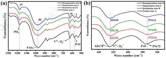 To analyze the molecular valence bonds, functional group vibrations, rotational energy level transitions, and reaction reversibility of Na3V2(PO4)3@C during sodium extraction, magnesium intercalation, and magnesium deintercalation, ex situ FTIR tests were conducted on the Na3V2(PO4)3@C materials in the aforementioned four charge–discharge states, as shown in Figure 6. Ex situ FTIR analysis confirms the reversibility of functional group changes. In the sodium extraction stage (A → B), the P-O stretching vibrations of PO4 tetrahedrons (970 cm−1, 1175 cm−1) and the V3+-O2− vibrations of VO6 octahedrons (624 cm−1) shift to higher wavenumbers. This shift is due to the oxidation of V3+ to V4+/V5+. During the magnesium intercalation/deintercalation stages (B → C → D), the aforementioned peak positions gradually return to their initial positions. This indicates that the PO4 and VO6 frameworks are stable with no irreversible bond breakage, which further verifies the intercalation–deintercalation reaction mechanism. Ex situ FTIR results show no irreversible breakage or reconstruction of the PO4 structure in NVP@C. During the magnesium storage reaction, the redox reaction between V3+ and V4+/V5+ is reversible, with no irreversible valence state trapping (e.g., V5+ cannot be reduced to V3+). Throughout the magnesium storage process, no new functional group vibration peaks (such as Mg-O-C, V-O-C) appear in the FTIR spectra. This reveals two points: ① No significant irreversible reactions occur between the electrolyte (Mg(TFSI)2/DME) and NVP@C, such as the esterification reaction between solvent DME and PO43−; and ② the formation of the CEI film—resulting from slight electrolyte decomposition—does not damage the chemical structure of the NVP@C bulk.