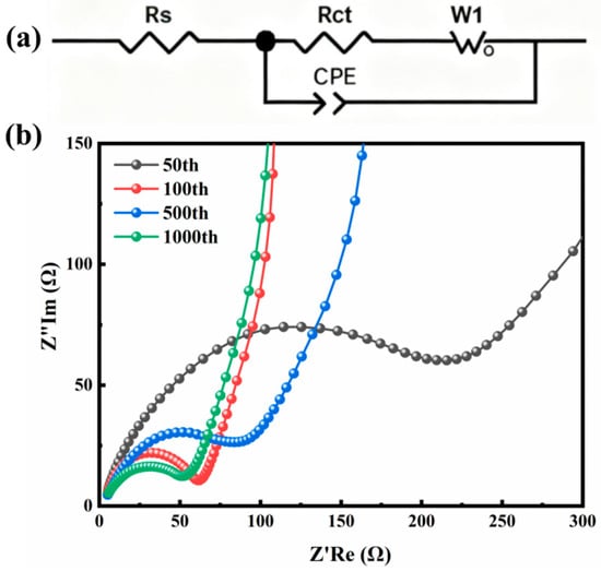To investigate the specific reason for the deterioration of the magnesium storage performance of the Na3V2(PO4)3@C cathode material at a high current density of 500 mA/g in Mg(TFSI)2/DME electrolyte, electrochemical impedance spectroscopy (EIS) was used to test the cathode’s reaction kinetic characteristics. For the tests, a two-electrode system was used. The working electrode was Na3V2(PO4)3@C, while the reference and counter electrodes were both activated carbon coated on copper foil. EIS results under different cycle numbers were fitted using Zviewer software (version 3.1), as shown in Figure 7. Figure 7b shows a semicircle in the high-frequency region and a straight line in the low-frequency region. Based on this feature, the equivalent circuit diagram of the Na3V2(PO4)3@C cathode material under these experimental conditions was determined in Figure 7a. Among the parameters, Rs denotes the transfer resistance at the solid–liquid interface. Rct is the charge transfer resistance of the electrochemical reaction, corresponding to the radius of the high-frequency semicircle. Warburg impedance (W1) reflects the ion diffusion and migration ability, corresponding to the low-frequency straight line. CPE (constant phase element) is the capacitance at the interface between the positive and negative electrodes.