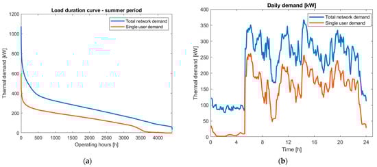 The present analysis focuses on the summer period, during which the DH network operates exclusively to satisfy the DHW demand. This operating condition is particularly relevant for the integration of thermal prosumers, as it represents a period of low system load in which the contribution of distributed renewable generation can significantly reduce the operation of conventional thermal plants, moving towards a fully renewable network configuration.