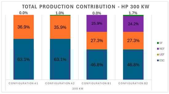 The following graphs show some comparisons to clarify the main differences between the scenarios. In Figure 8 the contributions related to the produced energy—ESC, UEF, NEF, and SF—are presented in these stacked column charts for three different sizes of heat pump. For what concerns the first configuration, it can be noted that the difference between the scenarios with and without storage (1A and 1B) is minimal: only for larger heat pump sizes is a part of the energy accumulated, but even in this case it is minimal compared to the other contributions (it reaches a maximum of 1% for a 300 kW HP). The largest share of energy produced is used for self-consumption by the user. For what concerns the second configuration, the network export fraction is introduced. A significant portion of the power produced, which increases with the increase in size, could be used to supply other distribution networks. In Configuration 2B, the storage system allows to cover the demand even when it exceeds production. Although the percentage of stored energy is small (around 2–3%), its contribution is relevant since it increases the network self-sufficiency. In this configuration, the amount of energy available for other sub-grids slightly decreases.