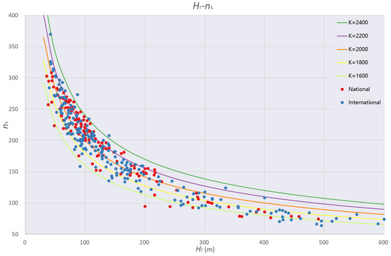 Specific speed () is a well-established index for evaluating the overall energy performance of hydroelectric turbines. With continued advancements in turbine technology, () values across different head ranges have exhibited a gradual upward trend. However, further increases in () are inherently limited by several key factors, including structural strength, cavitation behavior, sediment erosion, and hydraulic stability. Although higher specific speeds can reduce unit costs and allow for more compact powerhouse layouts, excessive pursuit of elevated () values typically compromises cavitation resistance, accelerates sediment-induced wear, and reduces operational stability. These trade-offs ultimately lead to lower peak efficiency and a narrower high-efficiency operating range, thereby undermining the goal of achieving enhanced overall performance. The statistical correlation between rated head and specific speed is illustrated in Figure 2.