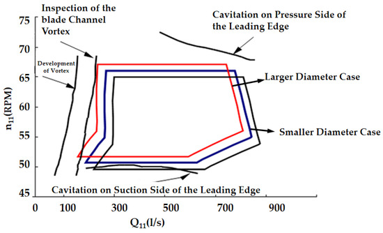 In contrast, adopting a larger runner diameter shifts the operating range toward lower discharge and higher unit speed. Under these conditions, the cavitation inception and development lines associated with blade channel vortices may encroach upon the normal operating zone, intensifying pressure pulsations at partial load and posing risks to the unit’s long-term stability. As the operating regime shifts further toward lower discharge, the frequency of operation at small guide vane openings increases. Consequently, the high-efficiency region, which normally aligns with or above the optimum opening under high-head conditions, may be displaced outside the practical operating envelope an outcome clearly unfavorable for reliable performance. Moreover, cavitation inception on the pressure surface near the blade leading edge may further degrade turbine efficiency and stability. The influence of runner diameter on the shift of the operating range is depicted in Figure 3.