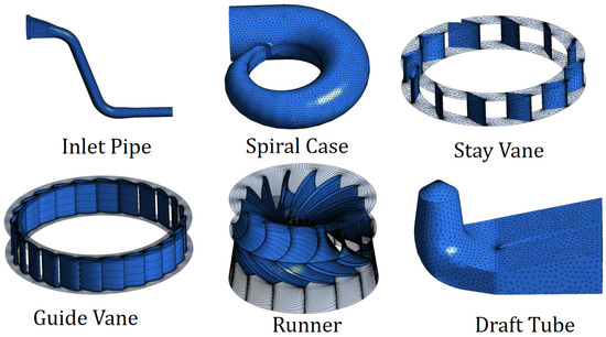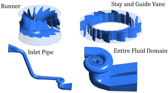 Using the original engineering drawings from the power station, a comprehensive three-dimensional geometric model of the turbine system was established, representing both the structural and hydraulic domains. The structural configuration includes key components such as the upper crown, lower annular labyrinth seal, and pressure equalization pipe. To accurately reproduce the hydraulic behavior, the model also incorporates the pressure steel pipe section at the inlet, thereby capturing realistic upstream flow conditions. The complete computational domain, comprising the inlet pressure steel pipe, spiral casing, stay vanes, guide vanes, runner, and draft tube, is illustrated in Figure 4.