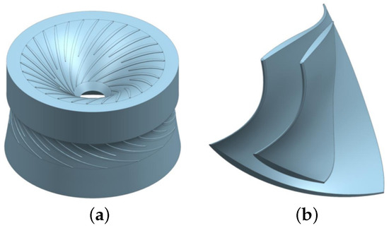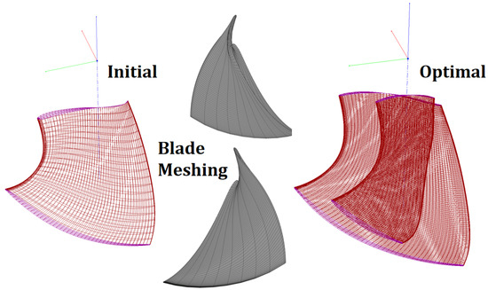Due to the wide inflow passage, a splitter-blade configuration was adopted. The blade profile was kept unchanged, with the leading edge set at 0 and the trailing edge at . The blade thickness was adjusted accordingly to regulate the inflow, while no additional control was applied at the outflow. The optimized runner model is illustrated in Figure 10.