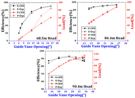 Prior to investigating the splitter-blade runner design, it was essential to evaluate the performance of the original runner in order to establish a baseline for subsequent comparison. For this purpose, 27 representative operating points under different heads and guide vane openings were selected for numerical simulation. The computational results were then compared with experimental measurements to validate the accuracy and reliability of the numerical methodology. The specific operating conditions are summarized in Table 3.