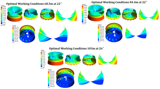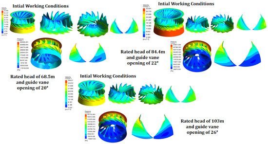 Comparison of pressure and velocity contour distributions under various operating heads (68.5, 84.4, and 103 m) and corresponding guide vane openings.