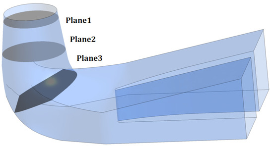 Pressure pulsations in the draft tube were evaluated under three selected load conditions: , , and of the rated load. Monitoring surfaces were defined such that Plane 1 and Plane 2 were located in the straight pipe section, while Plane 3 was positioned in the elbow section, as illustrated in Figure 9.