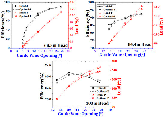Comparison of unit performance before and after optimization under different operating conditions at a 68.4 m head.