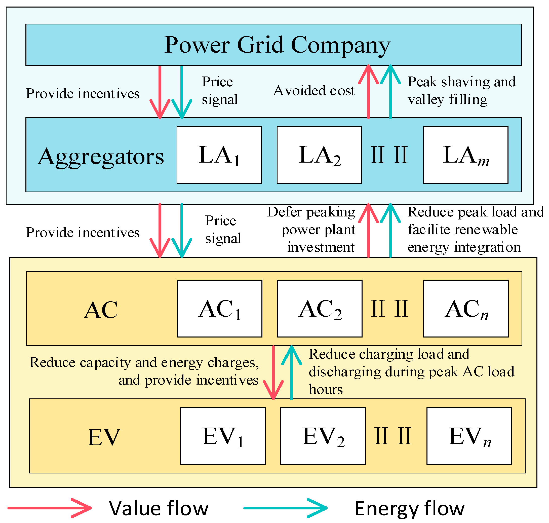 - Aggregators: Serving as pivotal intermediaries that link the grid with distributed end-users, aggregators pool dispersed V2G and AC resources and develop optimal scheduling strategies in line with grid demand. Through effective resource aggregation and coordination, they deliver high-quality demand response services at costs below electricity market prices, earning margin-based profits. Their main expenditures consist of incentive payments to end-users and operational platform costs, while their revenue originates from electricity market settlements with the grid company.