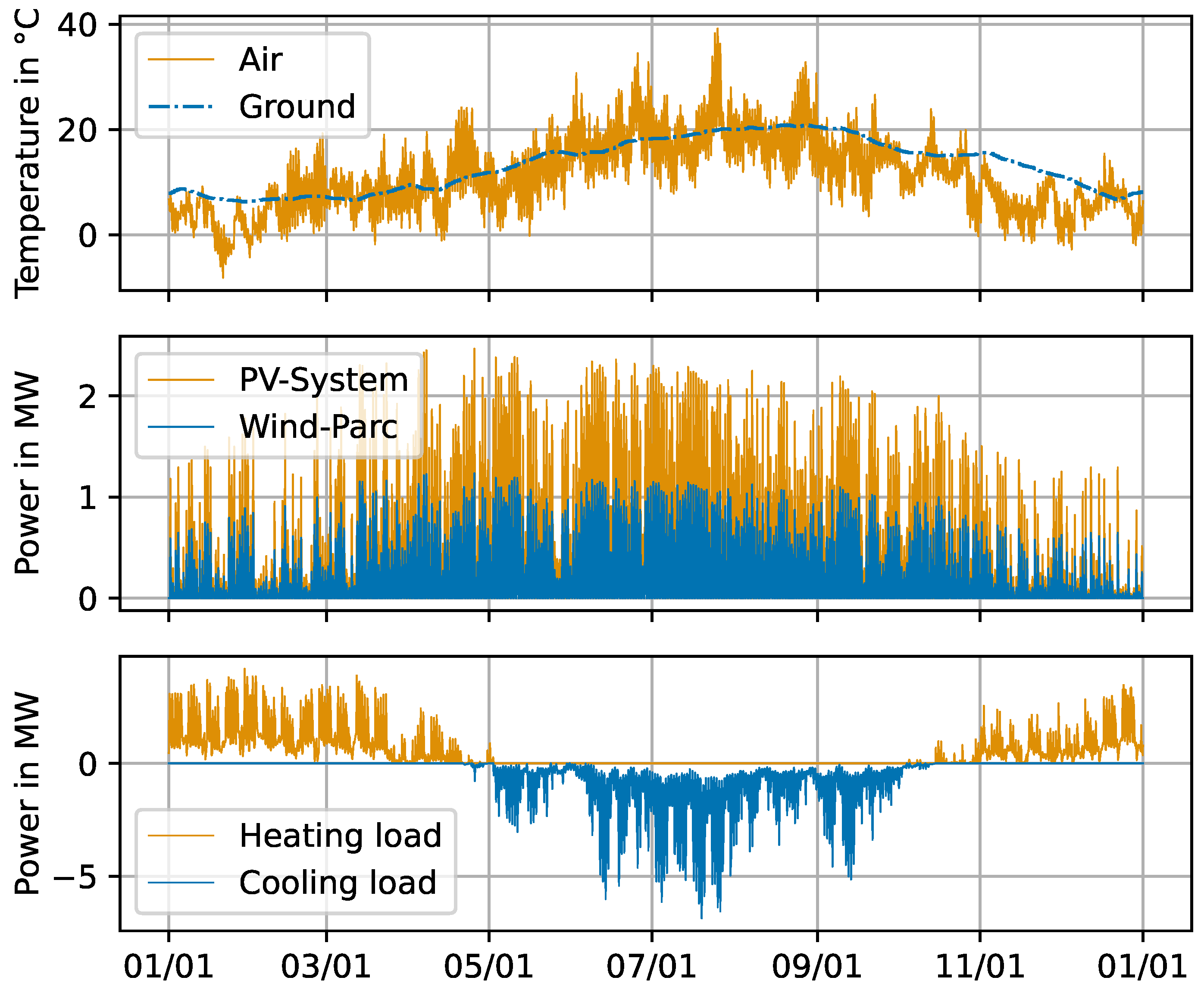 - Schonfeldt, P.; Grimm, A.; Neupane, B.; Torio, H.; Duranp, P.; Klement, P.; Hanke, B.; von Maydell, K.; Agert, C. Simultaneous optimization of temperature and energy in linear energy system models. In Proceedings of the 2022 Open Source Modelling and Simulation of Energy Systems (OSMSES), Aachen, Germany, 4–5 April 2022; pp. 1–6. [Google Scholar] [CrossRef]