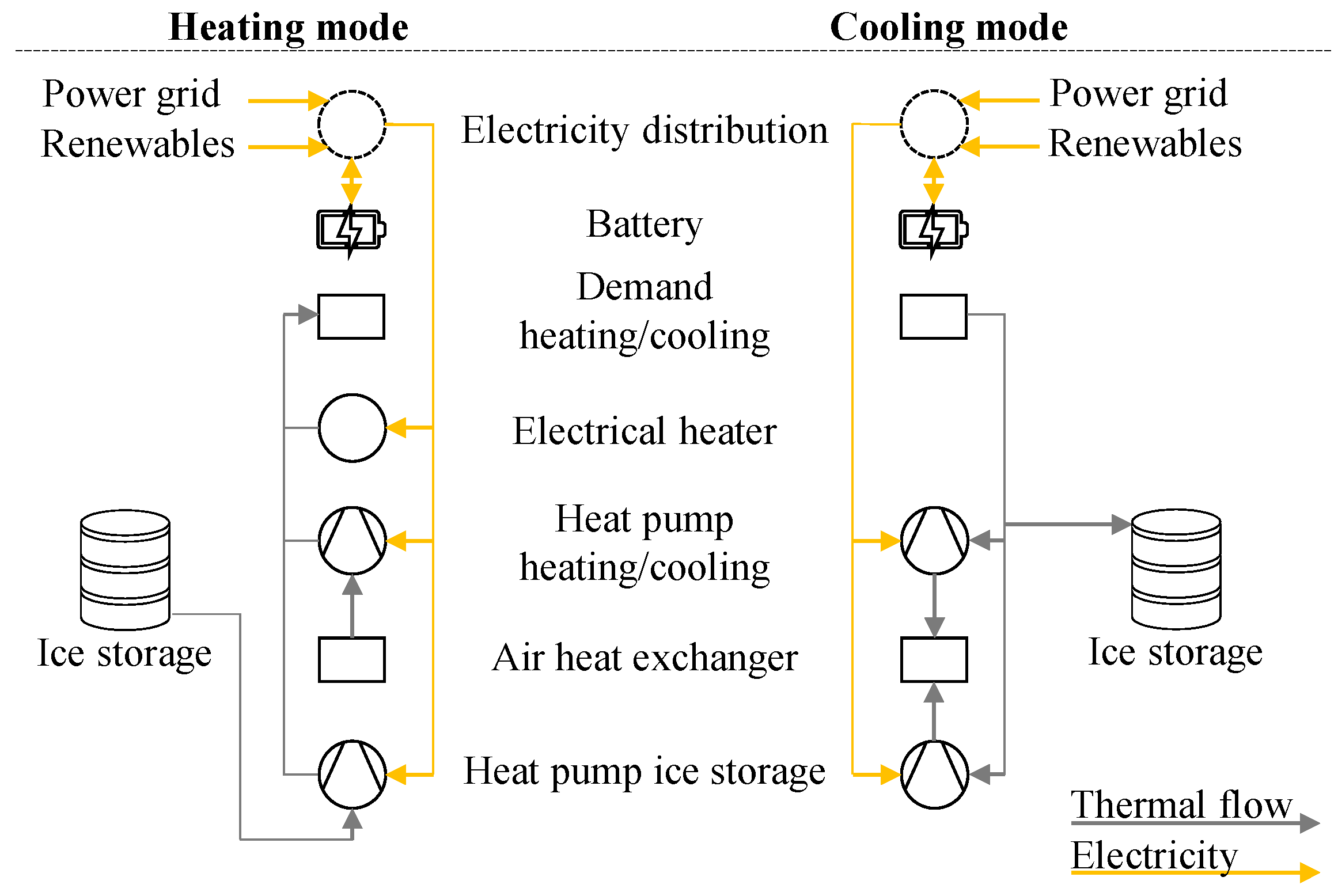 - Mancin, S.; Noro, M. Reversible Heat Pump Coupled with Ground Ice Storage for Annual Air Conditioning: An Energy Analysis. Energies 2020, 13, 6182. [Google Scholar] [CrossRef]