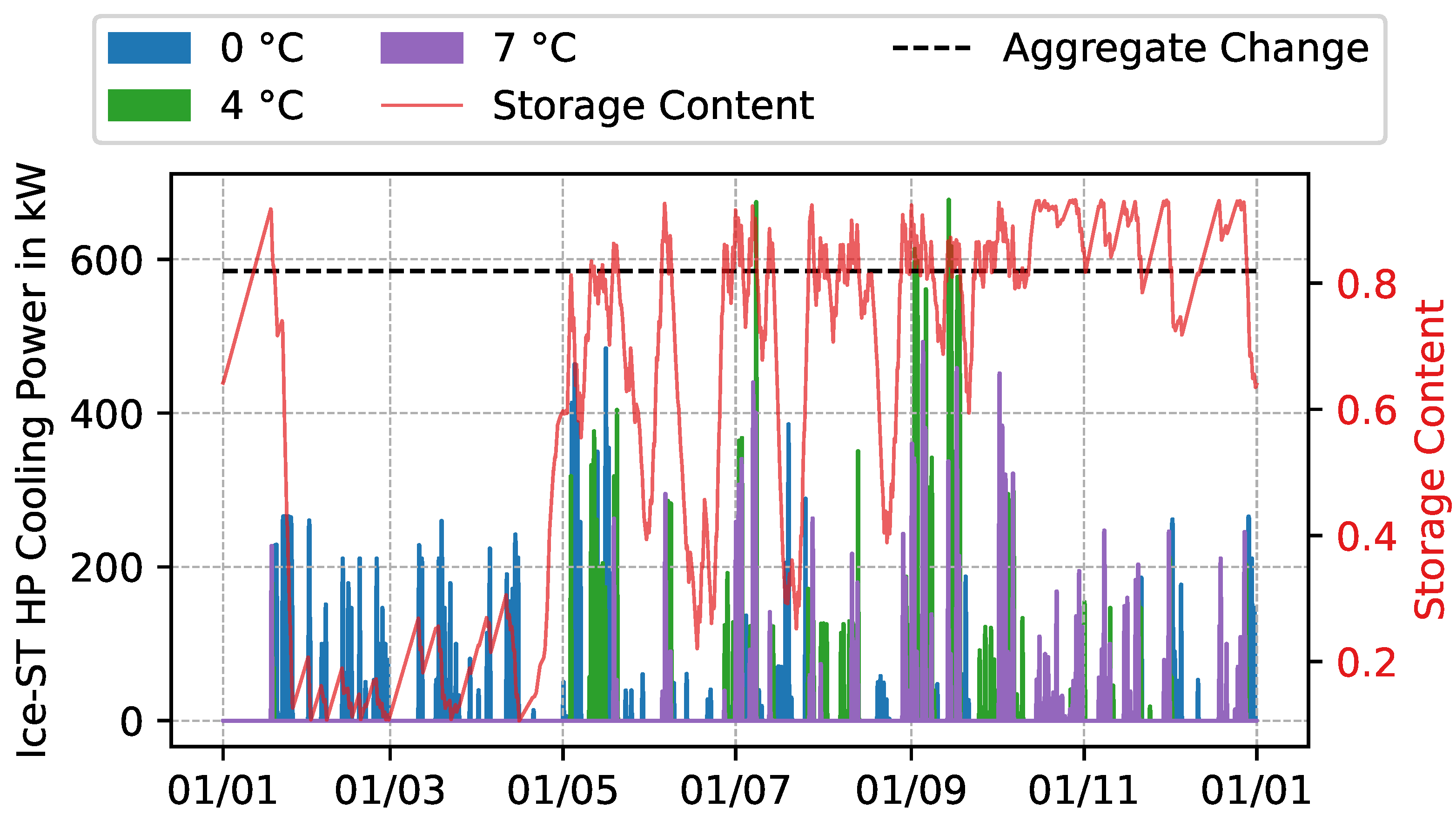 - Vivian, J.; Heer, P.; Fiorentini, M. Optimal sizing and operation of seasonal ice thermal storage systems. Energy Build. 2023, 300, 113633. [Google Scholar] [CrossRef]