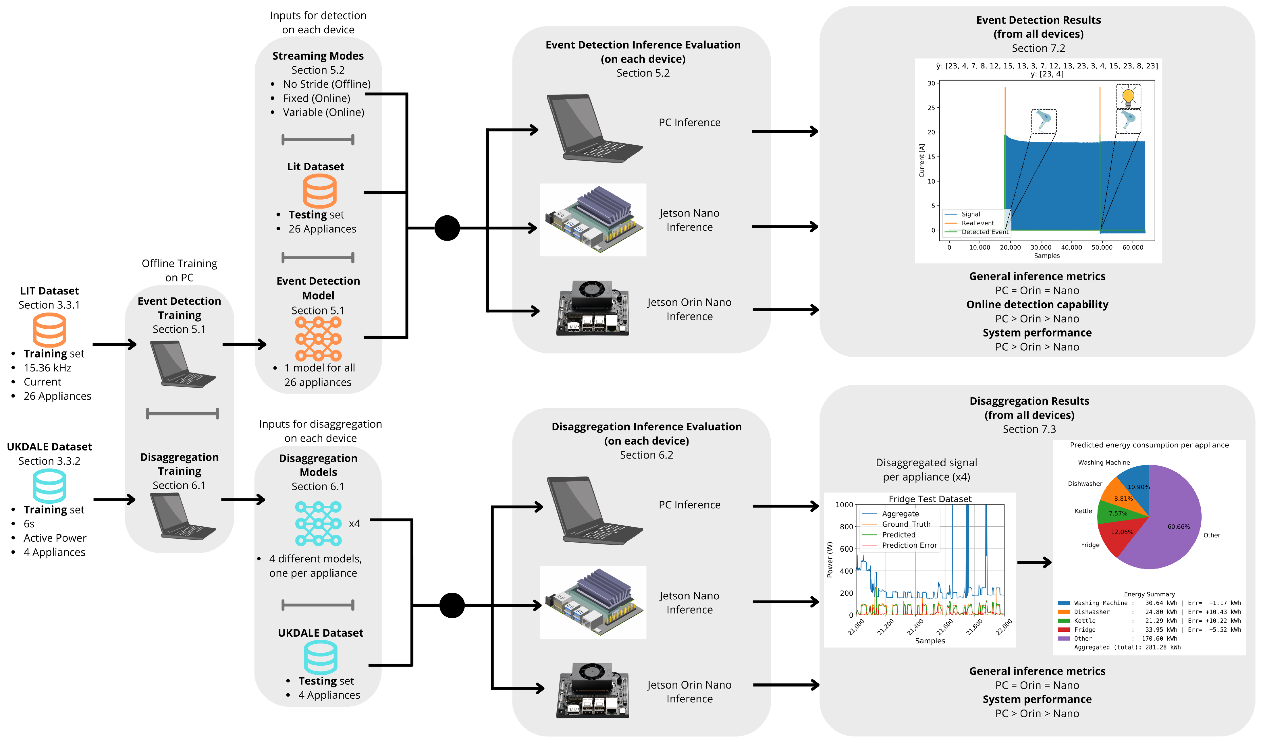 This section presents a summary and conclusion of all key metrics, beginning with the training performance and resulting models for both event detection and load disaggregation, as evaluated on the PC. It reviews training durations, model complexity, and resource usage. Following this, this section compares inference performance across different hardware platforms, PC, Jetson Nano, and Jetson Orin Nano, highlighting differences in processing time, resource usage, and accuracy.
