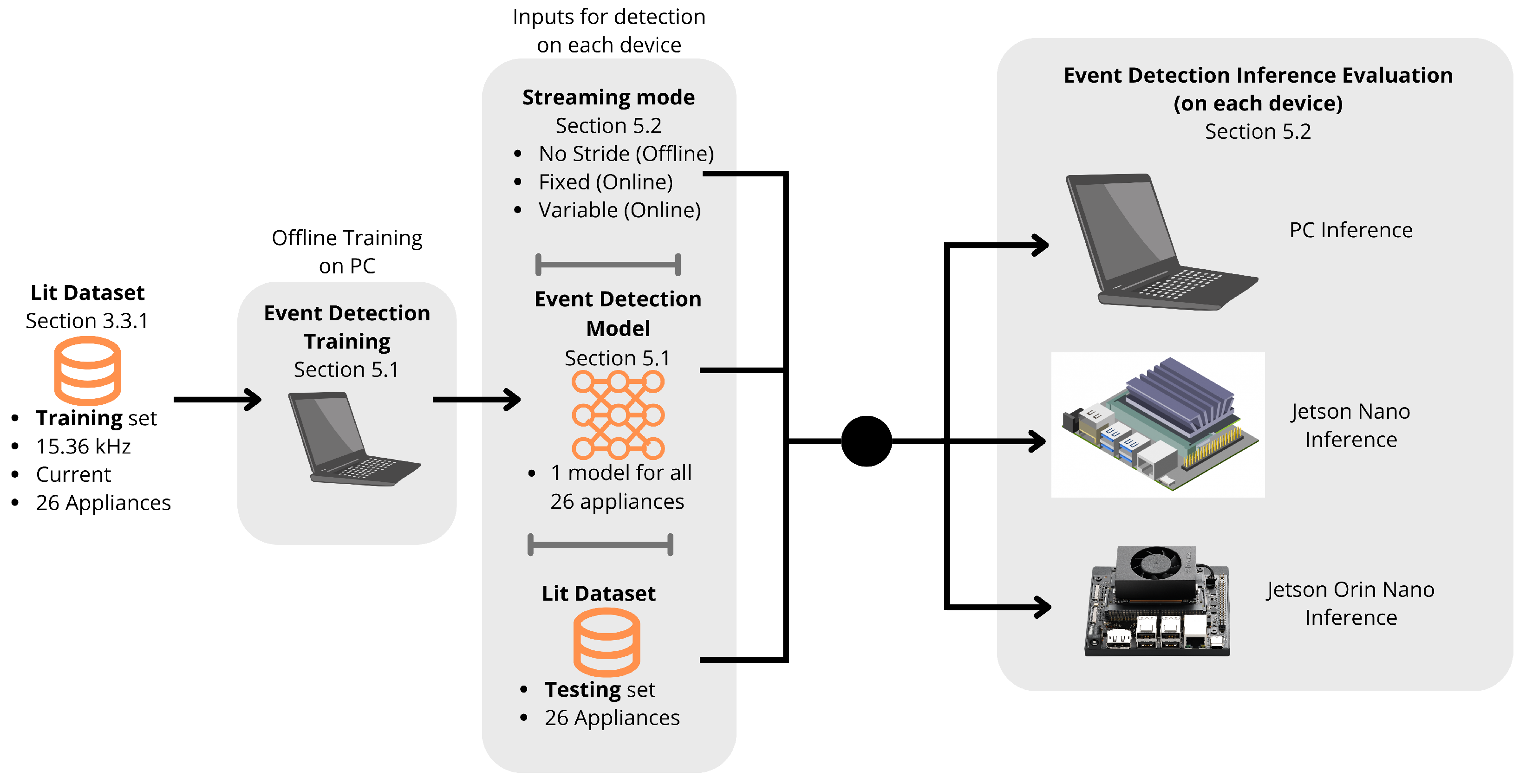 Section 5 presents the training and inference procedures for the event detection algorithm, evaluated on the PC, Jetson Nano, and Jetson Orin Nano, with corresponding resource usage and performance metrics. Similarly,