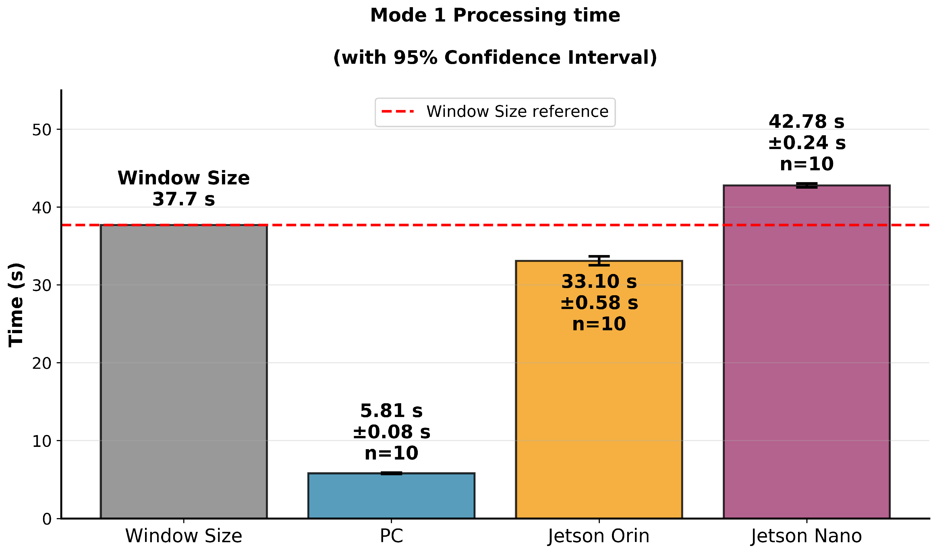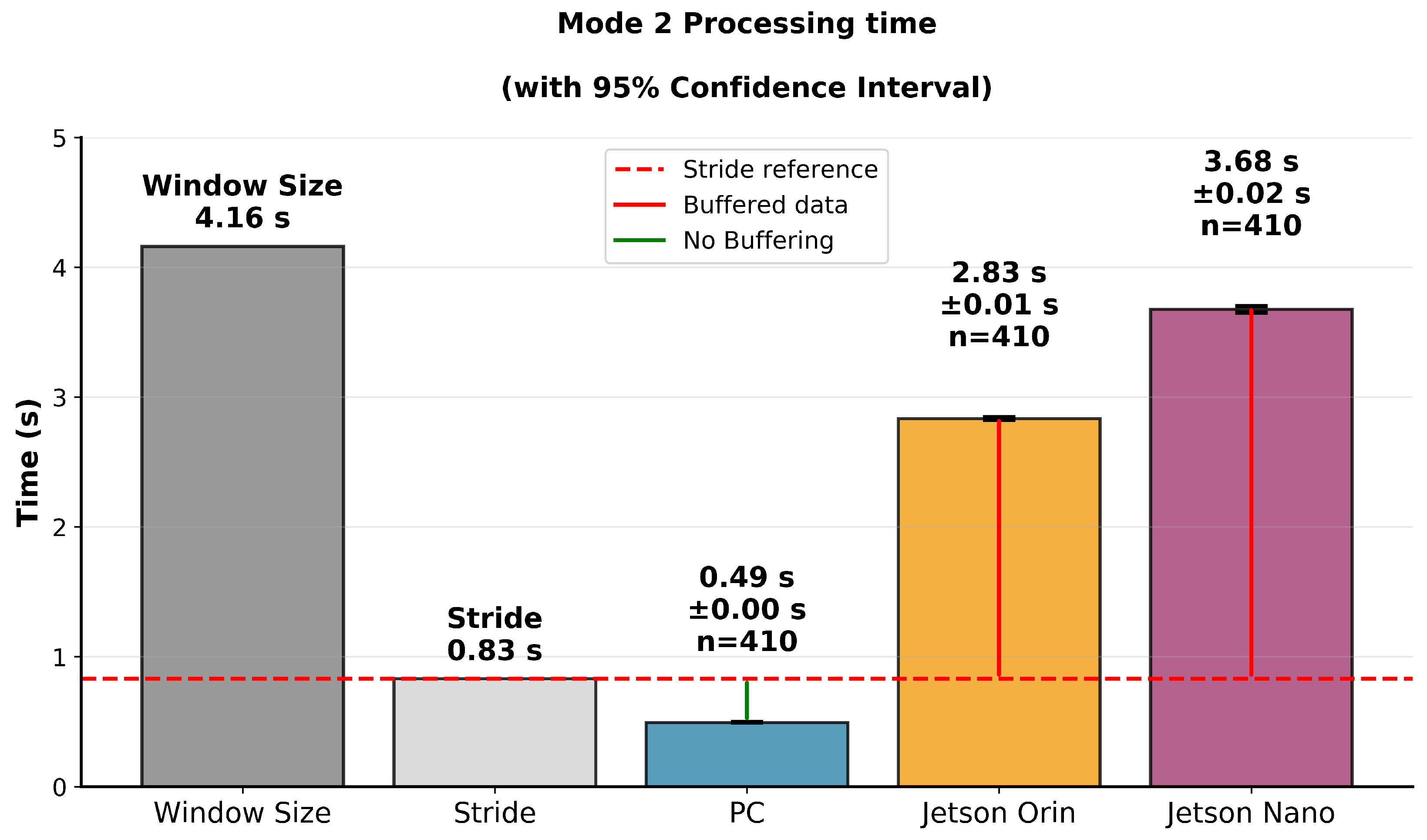 The Jetson Nano exhibited even greater performance limitations, being unable to sustain real time. It required approximately 3.7 s to process a 4.16 s window and 42.78 s for the full 37.7 s window. These processing times are far from sufficient for stride-based detection, making the device unsuitable for online use. Under adaptive stride, its detection accuracy dropped to only 55%, underscoring its limited applicability in latency-critical scenarios. Furthermore, in Mode 2, nearly 2.8 s of data is accumulated in the buffer during each iteration, further highlighting the severe mismatch between data acquisition and processing speed.