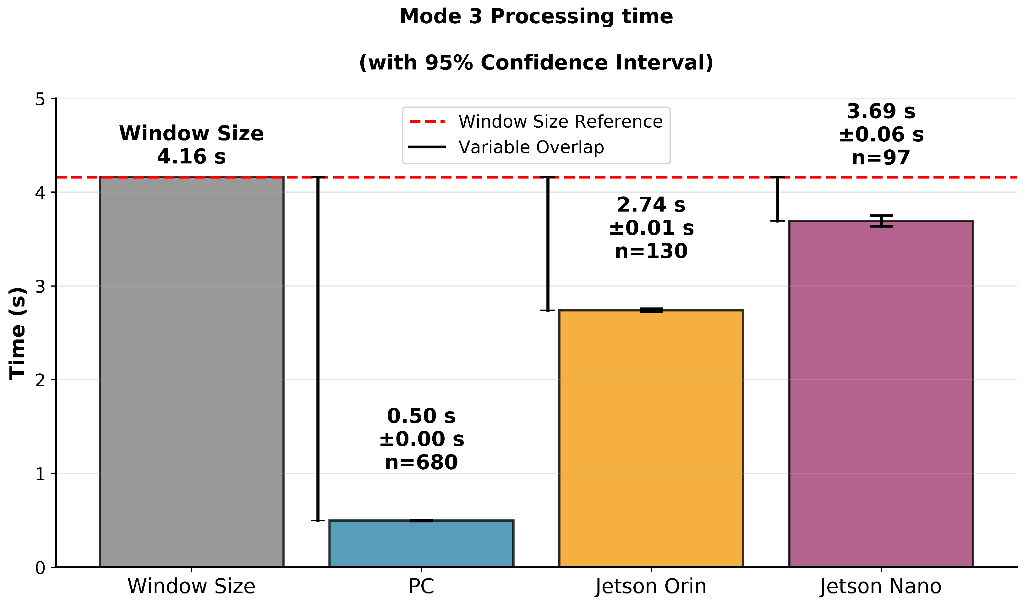 In summary, all devices evaluated are acceptable for offline processing tasks. However, the Jetson boards cannot achieve real-time detection in either Mode 2 or Mode 3, as their processing times are too high, leading to potential data buffering or missed detections caused by insufficient overlap.