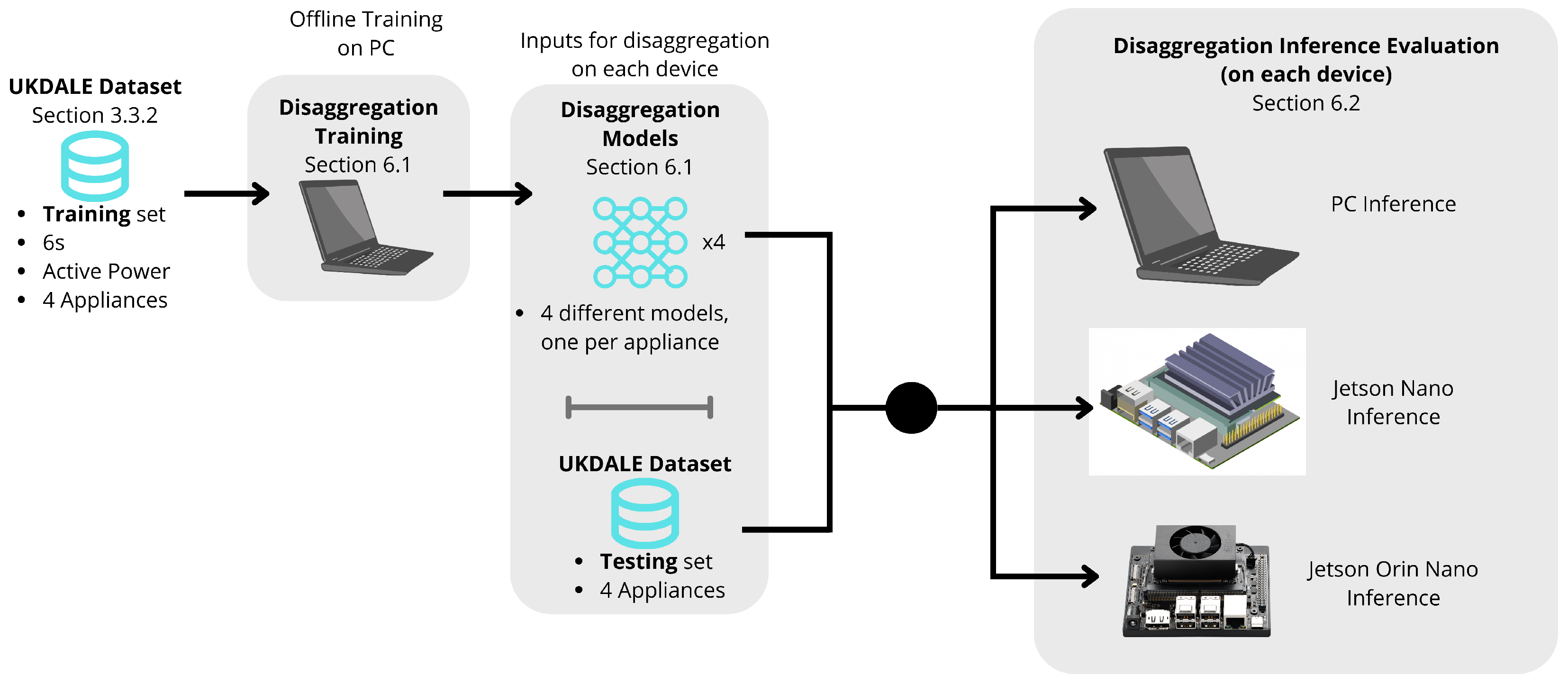 This section describes the complete workflow for the load disaggregation model, including both the training process conducted on a personal computer (PC) and the inference phase performed across all target platforms: the PC, Jetson Nano, and Jetson Orin Nano. Each device used its corresponding runtime environment, as detailed in