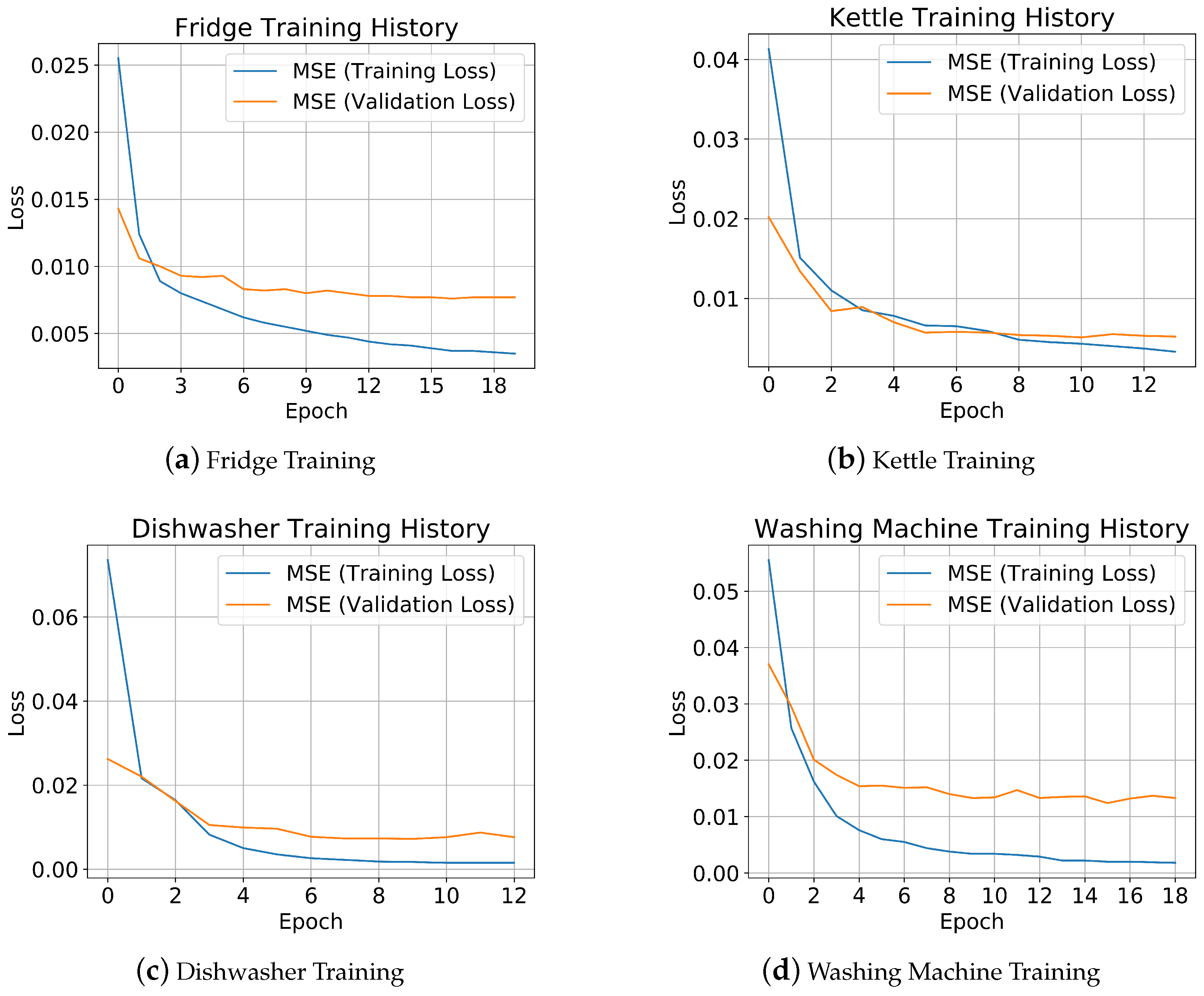 Table 7 confirms good training performance across all appliances. The training and validation metrics, MSE, MSLE, and MAE, remain low overall, with only minor increases in validation values, particularly for the dishwasher and washing machine. This supports earlier observations of minimal overfitting, suggesting that the models generalize well to unseen data.