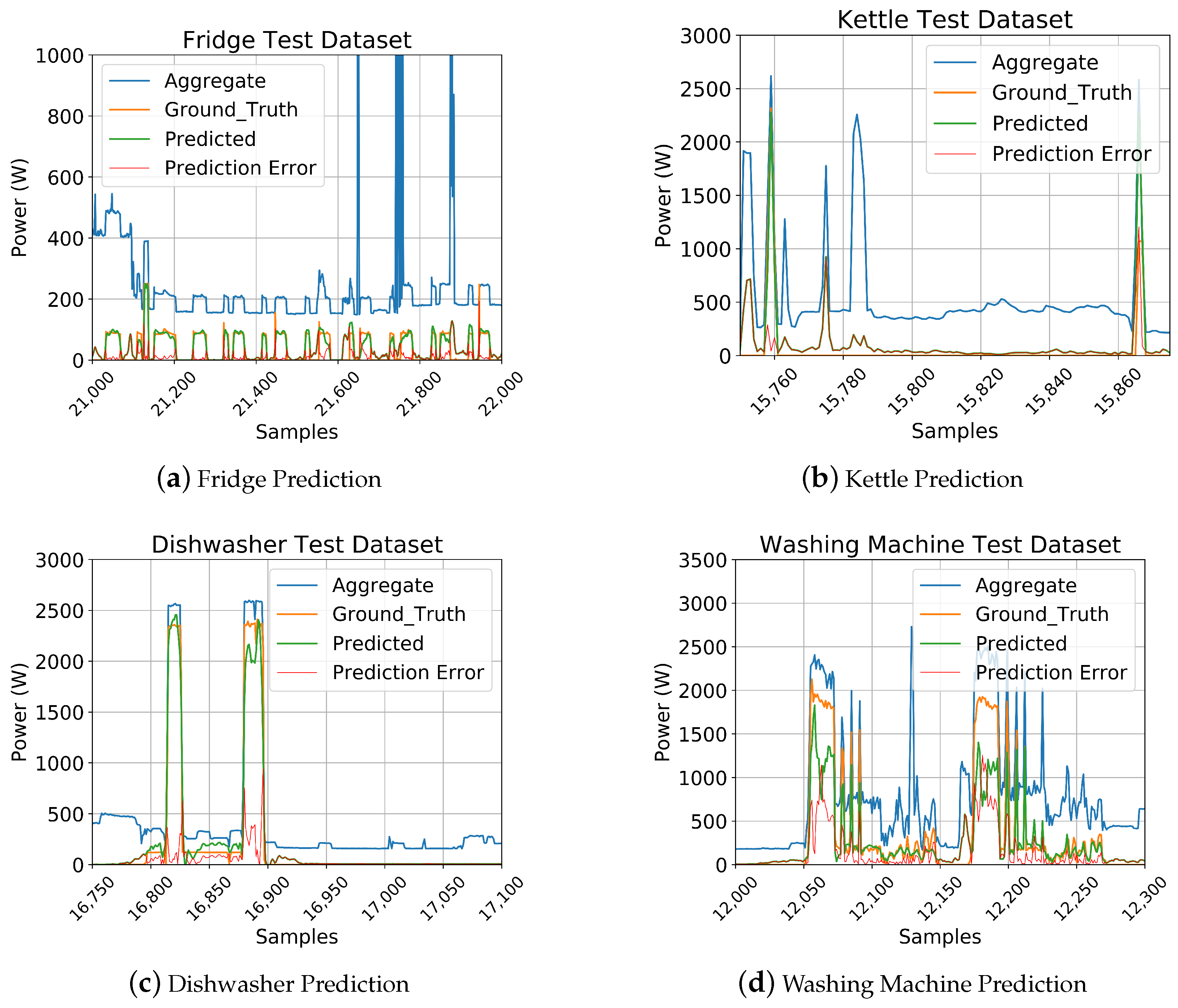 Figure 9 shows examples of the aggregated, ground truth, predicted signal, and prediction error for each appliance.