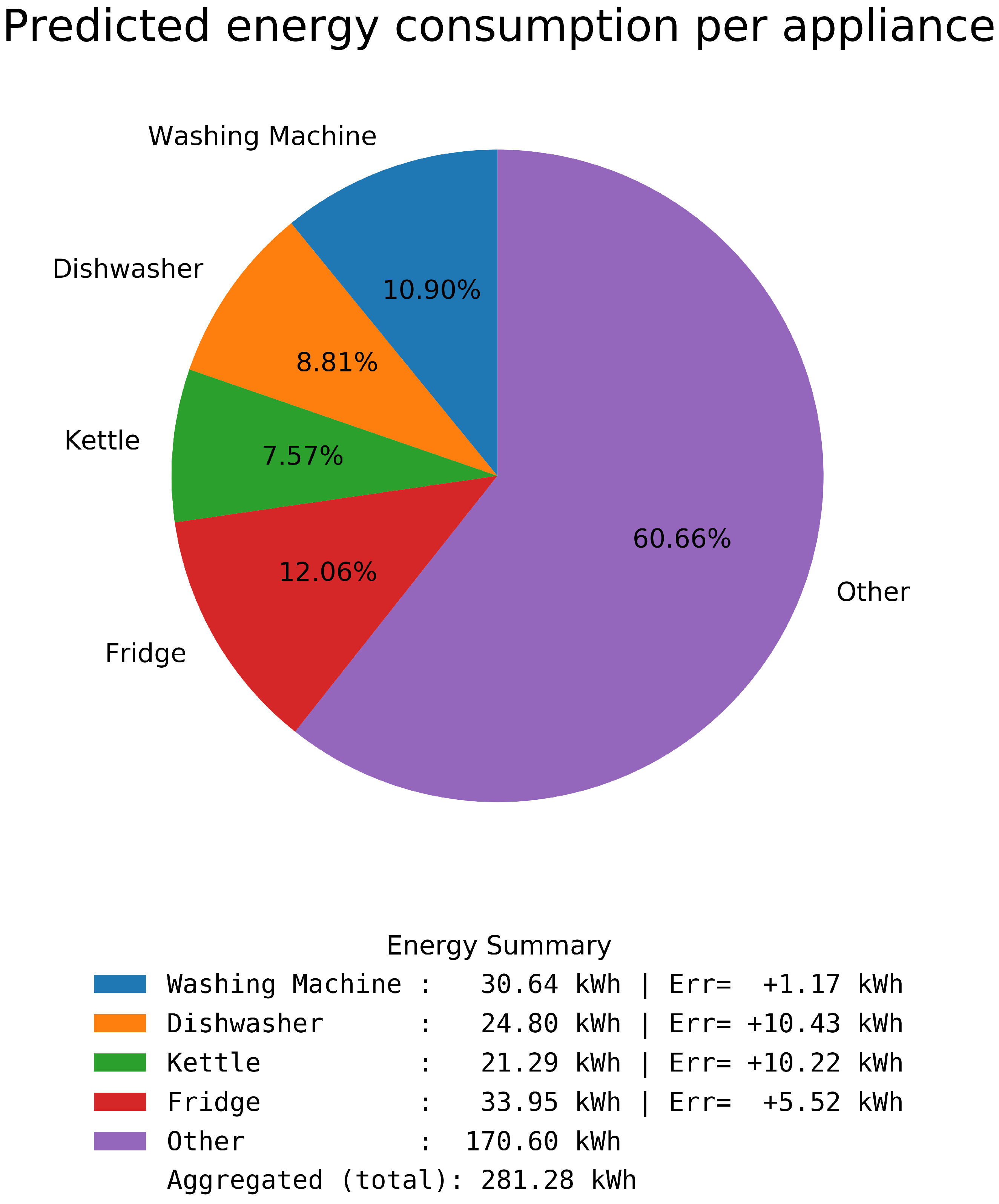 Despite the washing machine’s high appliance-level error, its cumulative energy error (SAE) is the lowest among all models in this study. This suggests that achieving low per-appliance error does not always translate into the most accurate overall energy consumption estimates.
