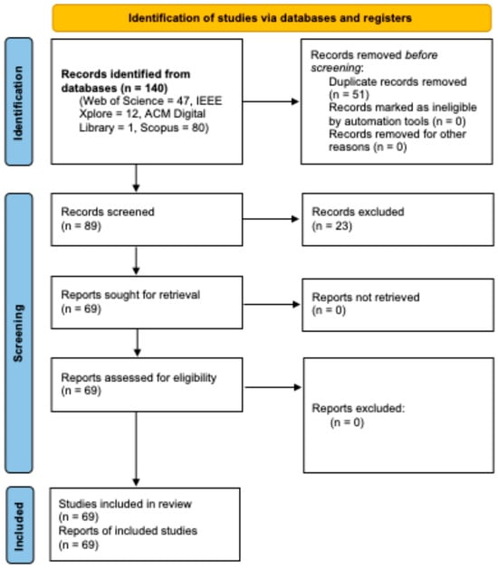 The search yielded 140 records (47 from Web of Science, 12 from IEEE Xplore, 1 from ACM Digital Library, and 80 from Scopus). A structured three-step screening process was applied, as illustrated in the PRISMA-ScR flow diagram (Figure 2). Duplicate records were first removed using a reference manager, resulting in 89 unique articles. Titles and abstracts were then screened independently by two reviewers using predefined inclusion and exclusion criteria (Table 1). Articles that did not address both district heating and digitalization or that lacked business-model relevance were excluded, leaving 69 papers for full-text assessment. Each remaining study was examined in full to verify alignment with the review objectives. Any disagreements between reviewers were resolved through discussion until consensus was achieved, and inter-rater reliability was verified (Cohen’s κ = 0.91), ensuring methodological consistency and minimizing selection bias.