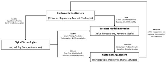 The literature notes heterogeneity of preferences, the risk that early enthusiasm decays, and the challenge of designing incentives that are fair across income levels and dwelling types. Hence, repeated calls for supportive regulatory frameworks and risk-tolerant financing to lower participation barriers and protect vulnerable users when dynamic pricing is introduced. Although customized, co-created services can move engagement from episodic to structural. But to scale, they require standardized participation contracts, customer-facing analytics that explain “how” savings arise, and safeguards that ensure equity when flexibility is monetized. Ultimately, these business-model choices are shaped by regulatory adaptation (tariff codes, consumer protections) as highlighted in Figure 3.