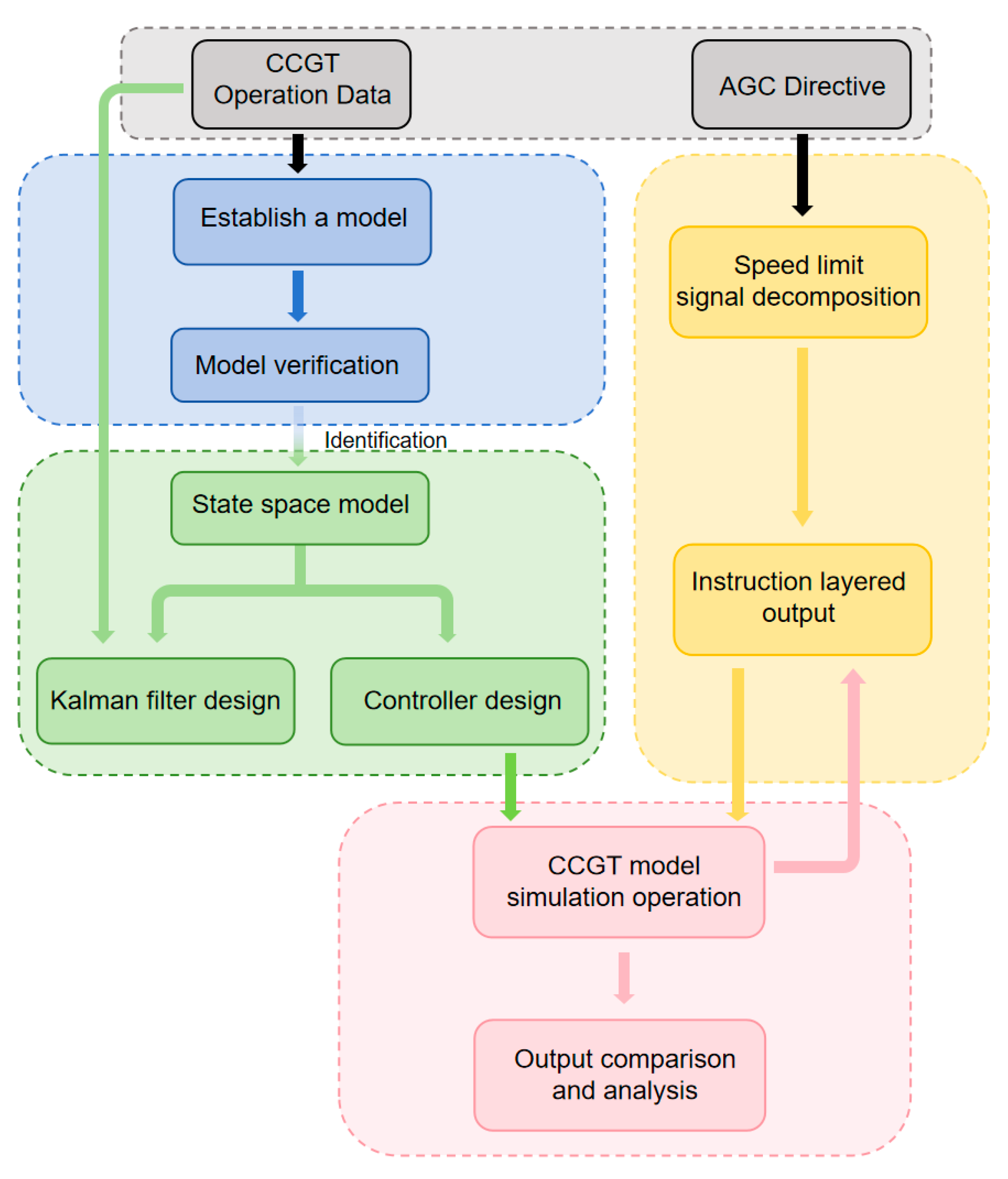 The organizational structure of this paper is as follows: First, a control-oriented dynamic model of the F-class CCGT is constructed. Decentralized unbiased fuzzy predictive controllers are designed for both the top and bottom cycles, with control accuracy improved through Kalman filtering and state augmentation mechanisms. Second, based on an online multiscale decomposition method for AGC command signals, the commands are divided into peak-shaving and high-frequency signals before being allocated to the gas turbine and steam turbine for coordinated response. Subsequently, a frequency regulation enhancement strategy for CCGT coordinated control is developed. This includes hierarchical power allocation based on rate-limited AGC decomposition, feedforward compensation for turbine response lag, and differential precompensation for AGC errors. This achieves multiple objectives: rapid AGC response, smooth power tracking, and controllable overshoot. Finally, the proposed method is simulated and evaluated against conventional MPC coordinated control strategies. The flowchart of the research subject is shown in Figure 1.