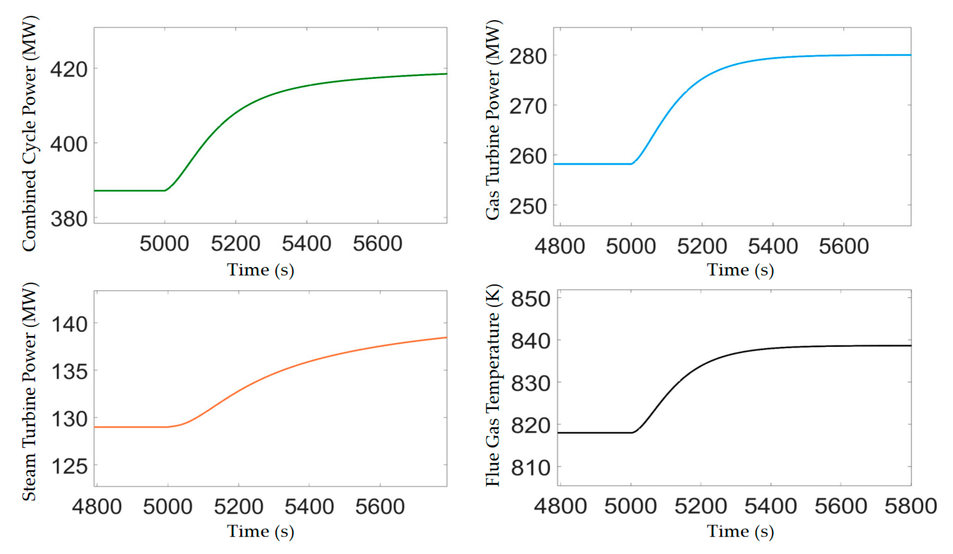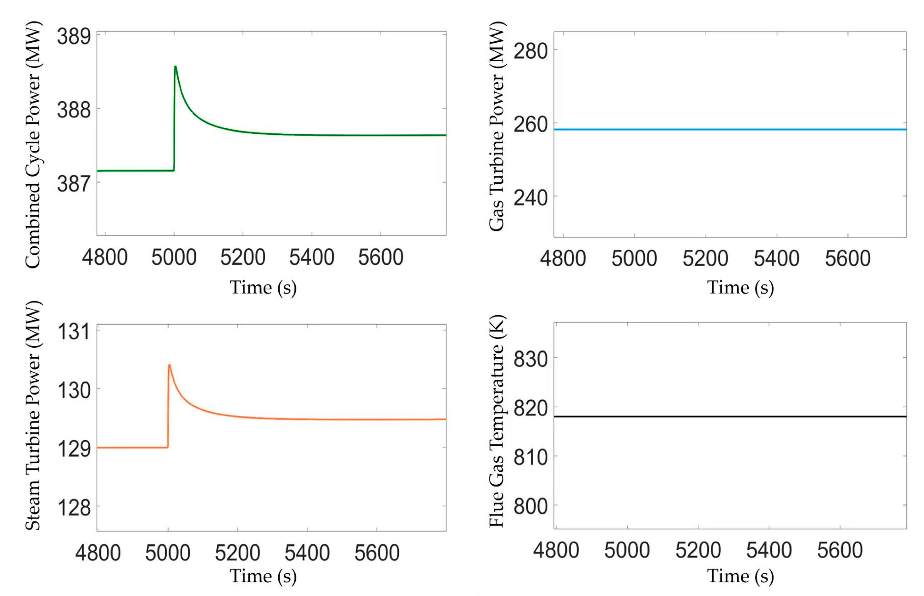 To further study its dynamic coupling characteristics, open-loop step simulation experiments were conducted at the equilibrium point of the operating conditions shown in Table 4. At 5000 s, the fuel flow and main steam valve were stepped by 5%, respectively. The response curves for CCGT power, GT power, ST power, and flue gas temperature are shown in Figure 3 and Figure 4.