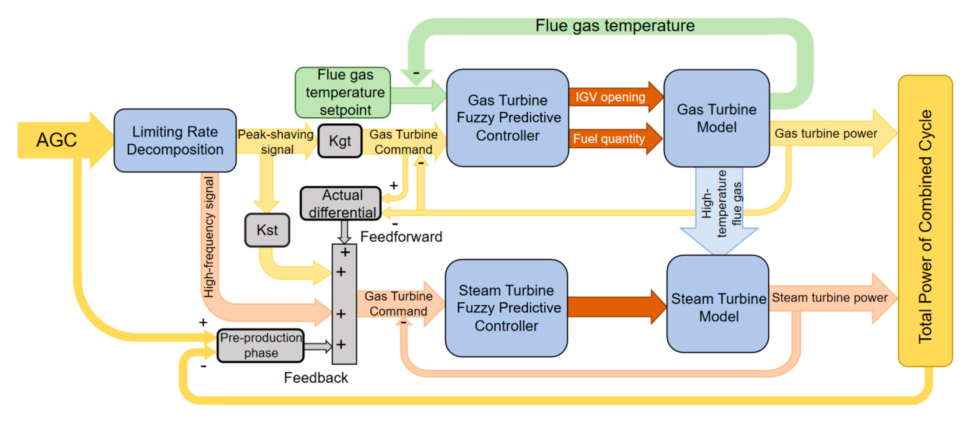 Thirdly, an outer AGC instruction decomposition can decouple the GT and ST power following according to different time-scale components, but a compensation link is still needed for the coupling caused by the closed-loop feedback of the total power. The design for the decentralized controllers of fuel to GT power and main-steam valve to ST power and their compensation link designed on the CCGT model will be introduced in Section 3.