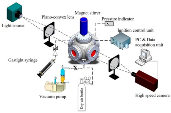 Schematic of the experimental system for the spherical outwardly propagating flame method [].