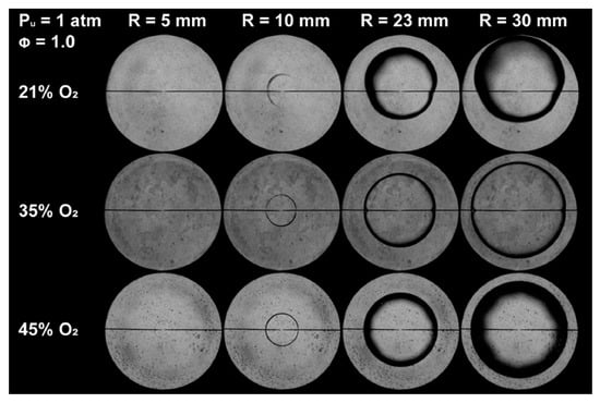 The spherical outwardly propagating flame method offers quasi-adiabatic conditions and unobstructed flame propagation, which facilitate the measurement of flame speeds under high-pressure environments. However, it also has notable drawbacks: the flame is subject to stretch effects, necessitating extrapolation correction for stretch; the ignition energy and initial flame propagation time are difficult to determine accurately; and flame instability can interfere with the identification of the flame edge. In the LBV measurement of pure ammonia and ammonia-blended fuels, the impact of such instability becomes even more prominent. Due to the low LBV of ammonia, the flame is severely affected by buoyancy-induced instability [], with the visual manifestation shown in Figure 2. Therefore, for ammonia flames, the spherical outwardly propagating flame method is not recommended for LBV measurement. This recommendation can be revised only if specific measures are employed, such as blending with high-reactivity fuels, oxygen-enriched combustion, and elevated temperature, to mitigate instability and enhance flame propagation.