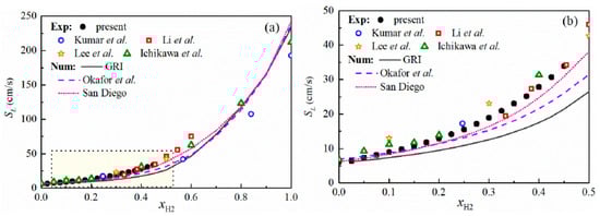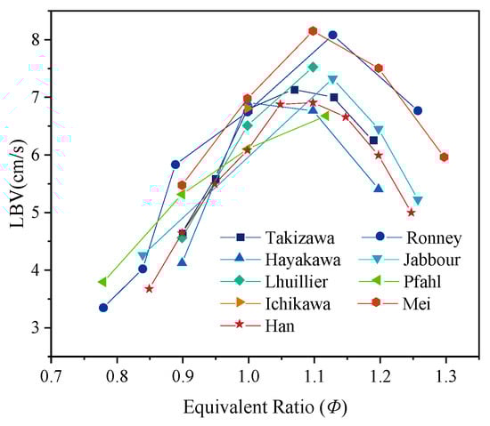 In a follow-up study, Han et al. [] measured the LBV of ammonia/hydrogen/air flames under different hydrogen blending ratios and equivalence ratios using the heat flux method, and compared the results with those from the aforementioned relevant studies, as shown in Figure 8. The LBV values under different operating conditions were generally consistent with previous studies, exhibiting an exponential increase with increasing hydrogen blending ratio.