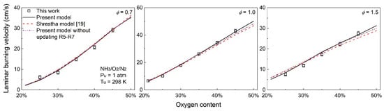 Recently, the use of oxygen-enriched air or even pure oxygen to assist ammonia combustion has also received considerable research attention. In the industrial sector, the Japan Science and Technology Agency (JST) and Osaka University conducted ammonia oxygen-enriched combustion experiments in a 10 kW industrial furnace. They found that when the oxygen concentration in the oxidizer reaches 30%, ammonia can achieve stable combustion, and the combustion temperature is higher than that of methane/air non-premixed combustion []. Grannell et al. [] reported that when the oxygen fraction in the oxidizer reaches 33%, an ammonia spark-ignition engine delivered the same power as a gasoline/air engine. The above industrial cases imply that oxygen enrichment has a pronounced effect on the LBV of ammonia flames.