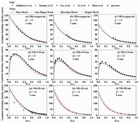 In Table 4, Wang et al. [], Shrestha et al. [], Ichikawa et al. [], and Goldmann et al. [] all examined the LBV of ammonia/hydrogen/air flames under high pressure. Their studies showed that while increasing hydrogen content increases the LBV, increasing pressure decreases it. In terms of numerical calculations, a number of models for ammonia/hydrogen flames have been developed, but their predictive accuracies differ markedly [,,,], requiring further optimization to enhance this accuracy.