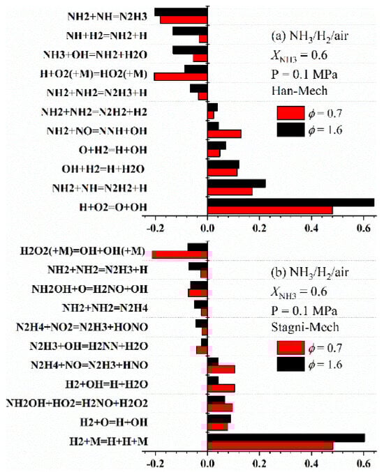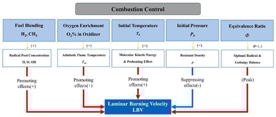 Given the extremely low LBV of ammonia, co-firing it with other high-reactivity fuels to boost the blended fuel’s LBV is a widely adopted approach to ensure ammonia’s stable combustion. Among these high-reactivity fuels, hydrogen and methane have been the most extensively studied [,,,].